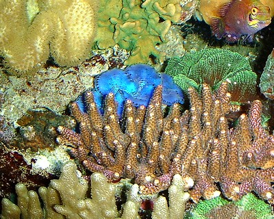 "Ultra" blue Tridacna maxima nestled in Acropora sp.